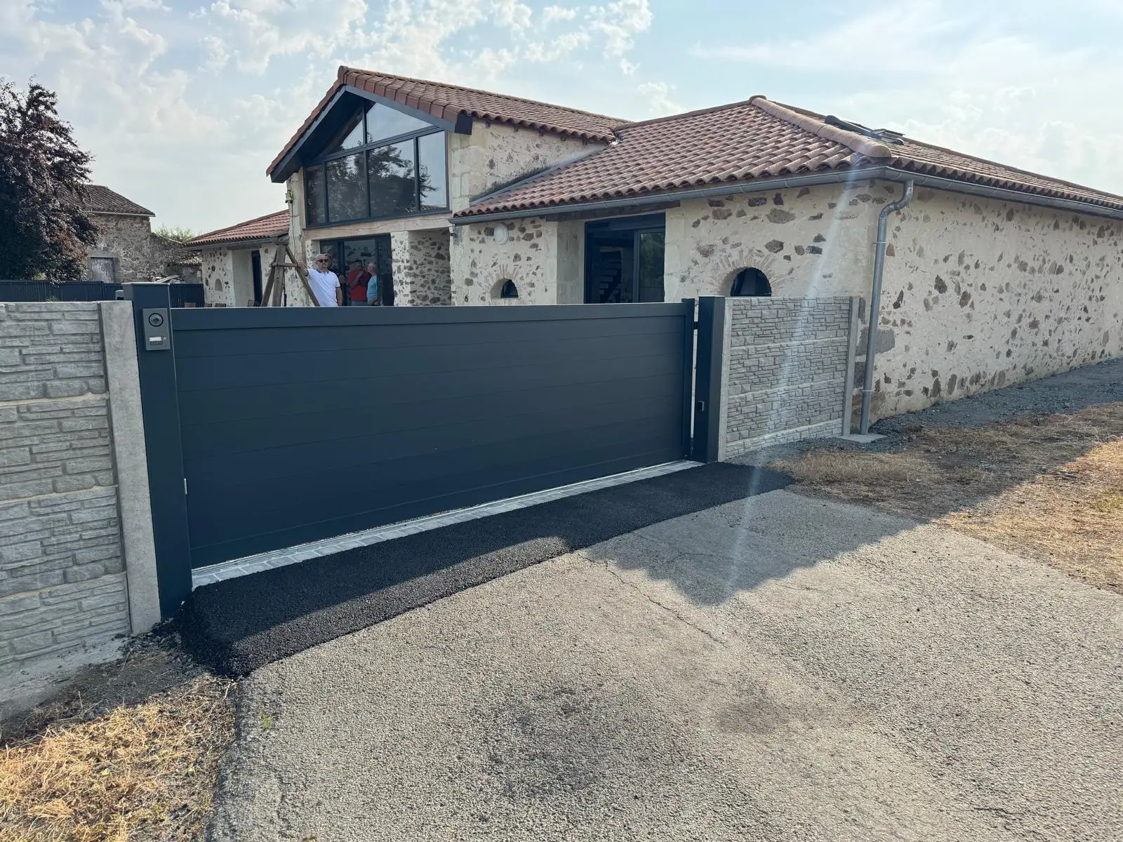 Le portail installé est un modèle en aluminium de couleur gris anthracite, choisi pour son style contemporain et sobre. Il s’intègre parfaitement à l’architecture de la maison en pierre, créant un contraste élégant entre modernité et authenticité.
